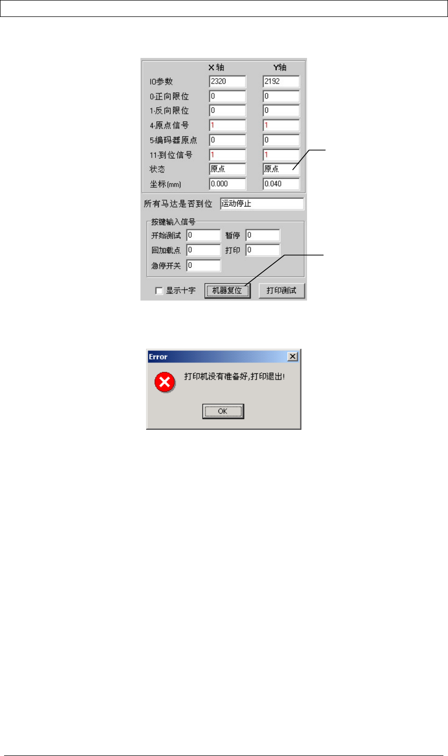 第二章 设备安装及维护 | 19 17. 检查机器是否能够正确复位。 按 AOITEST 的机器复位按钮,机器开始复位,机器停止后观察 IO 信号是否正确。 18. 检测打印机 连接好打印机,安装好打印纸,在 AOITEST 中按打印测试按钮,如果打印机正确,则会 正确打印测试内容,否则显示“打印机没有准备好”如下图: 19. 观察摄像机拍摄的画面是否反向或镜相, 否则设置摄像机 (请参考 2.2.1 摄像头的的参数) 复位结束后, X…