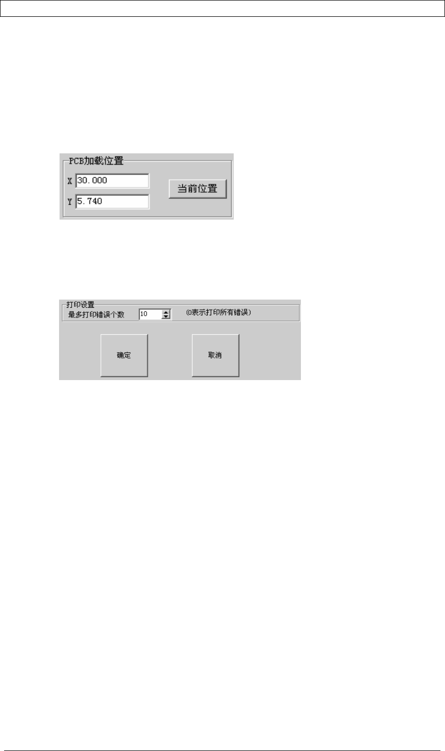 第二章 设备安装及维护 | 23 2.8 设置 PCB 加载位置 PCB 加载位置的设置是为了便于 PCB 板的取放。机器出厂前 PCB 板的加载位置已设置好,一 般不需更改。若已有的设置不实用时,可以对 PCB 板的加载位置进行适当的设置。具体步骤 如下: 在测试窗口中按移动按钮,使 X/Y 平台移到便于放 PCB 板的位置后,点击菜单〔系统设置〕 →〔系统设置〕 ,在 PCB 加载位置栏按当前位置,则 PCB 加载位置设置完成。 2…