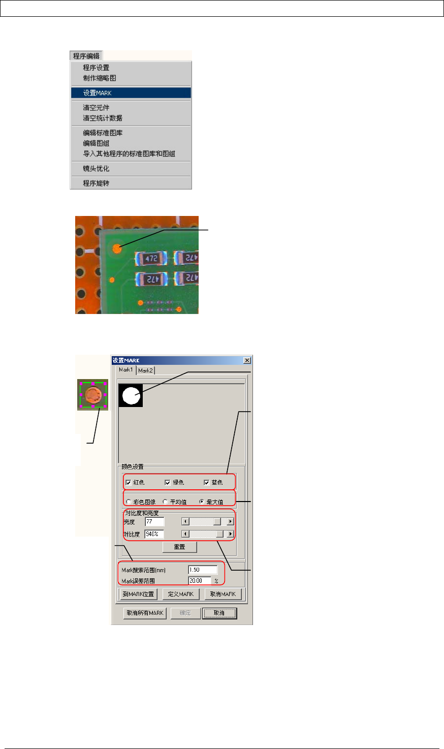 将 MARK 框移动到选定的 MARK 点,设置颜色参数和对比度亮度参数(当 MARK 点表面有异