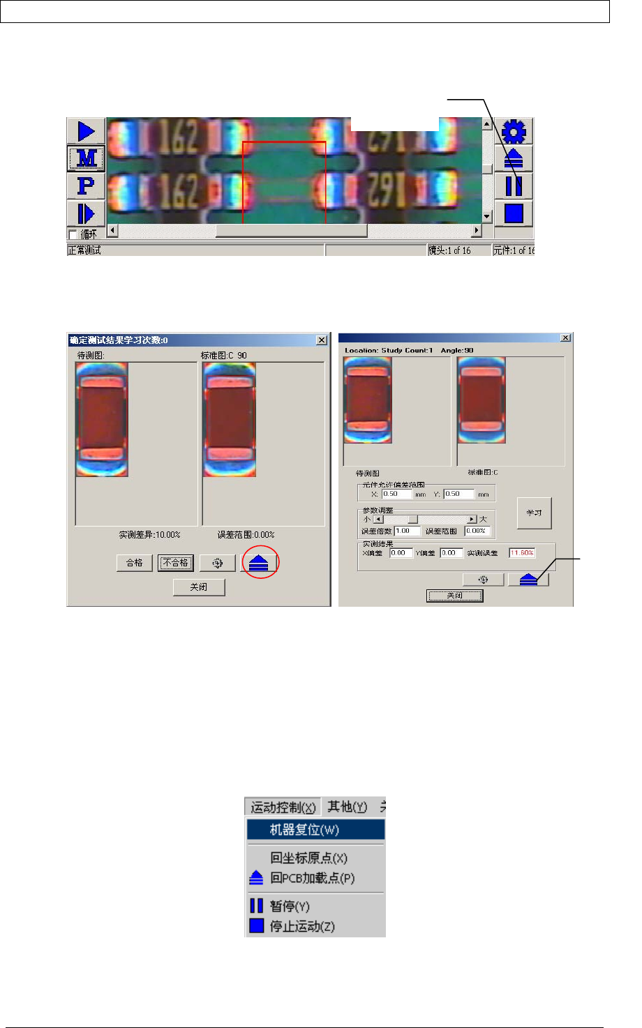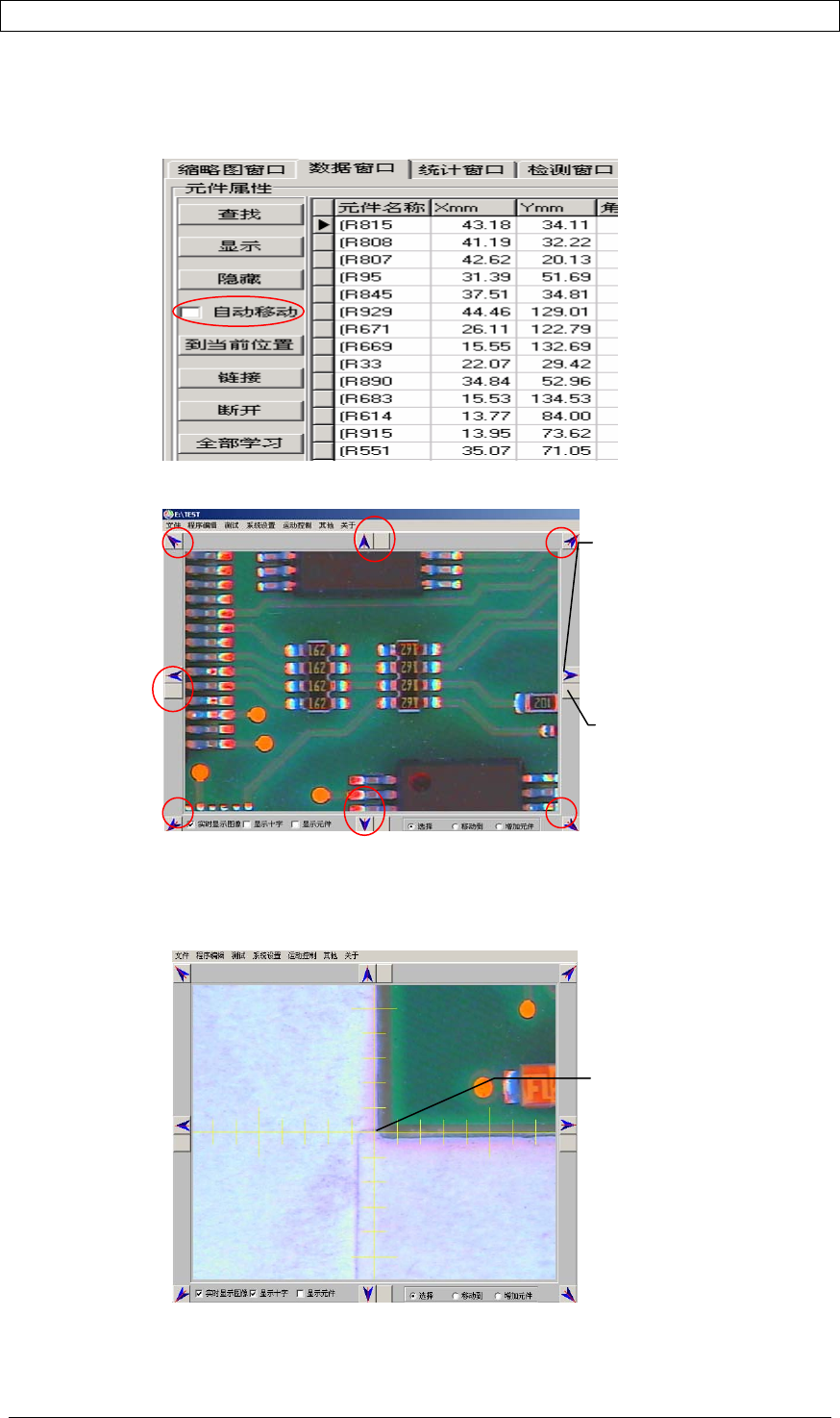 第四章 测试程序的制作(提高篇) | 38 ④自动移动 在数据窗口中,如果选择“自动移动” ,当数据记录变化时,机器自动移动到新的当前数 据位置。 ⑤手工按键移动 ⑥移动到坐标原点 运行菜单: 『运动控制』→『回坐标原点』 ,相机中心将移动到坐标原点(一般为 PCB 左下 角)位置,如下图: 手工按键 2 :按一下 此键, 机器只往按键 方向走 1 毫米。 手工按键 1 :为自由移 动键。 按住此键, 机器 会一直按你按键的方 向移动。…