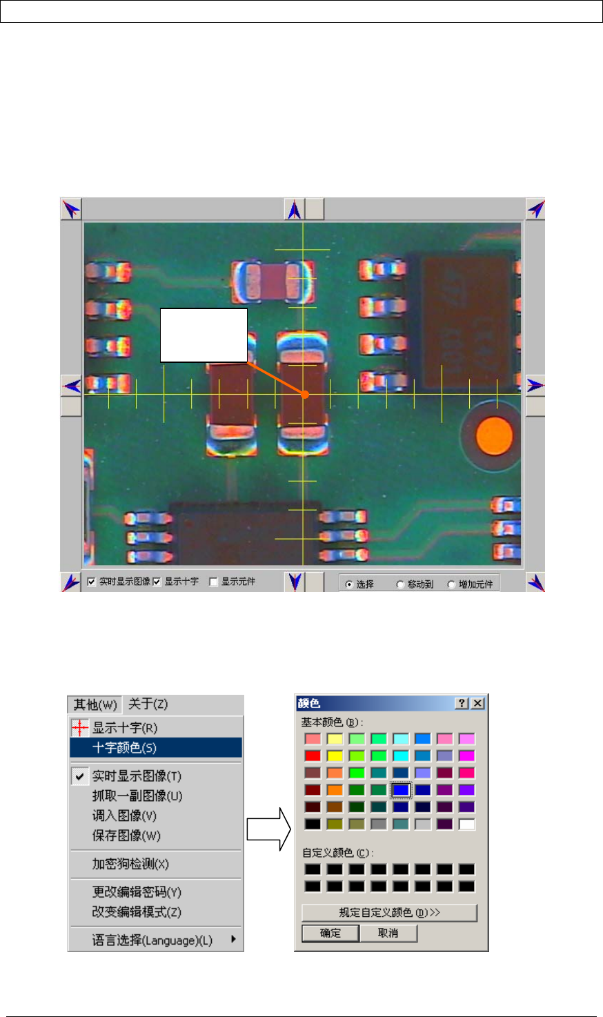 第六章 统计报表 | 64 第六章 其它菜单功能 6.1 实时显示图像 显示当前图像的所在位置 6.2 显示十字 1)定义颜色:定义的颜色保存在每个应用程序中。步骤如下: 点击菜单〔其它〕→〔十字颜色〕 ,即可改变显示十字的颜色。如下图: 摄像机当前 的拍摄位置