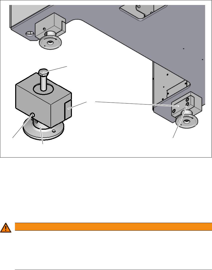 4 设置与调试 《用户手册》 SIPLACE E 4.3 设置贴片机 使用软件版本 SC 708.0 或更新 2014 年 12 月版 184 4.3.6 设置贴片机高度 (900 mm 到 930 mm) 贴片机设有 4 个支脚。 4 图 4.3 - 2 调节高度 (900 mm 到 930 mm) (1) 用于调节高度的调节螺 钉 (2) 锁紧螺钉 (3) 贴片机支脚 (4) 夹持装置 (5) 三个固定螺钉 4 警告 受伤危险! 即…