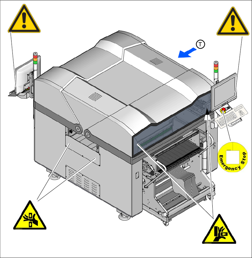 图 2.2 - 3 (单面)贴片机上的警告标签 - 1 号料位
