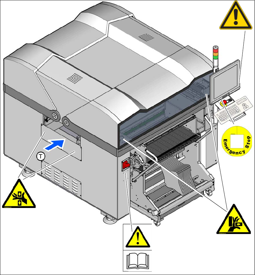 《用户手册》 SIPLACE E 2 操作安全 使用软件版本 SC 708.0 或更新 2014 年 12 月 版 2.2 警告标签 43 图 2.2 - 3 (单面)贴片机 上的警告标签 - 1 号料位 – W201,项目编号:030093 38-01 – W203,项目编号:030093 42-01 – W204,项目编号:030093 43-01 – W209,项目编号:030093 49-01 – W- 一般警告, 供应商提供的…