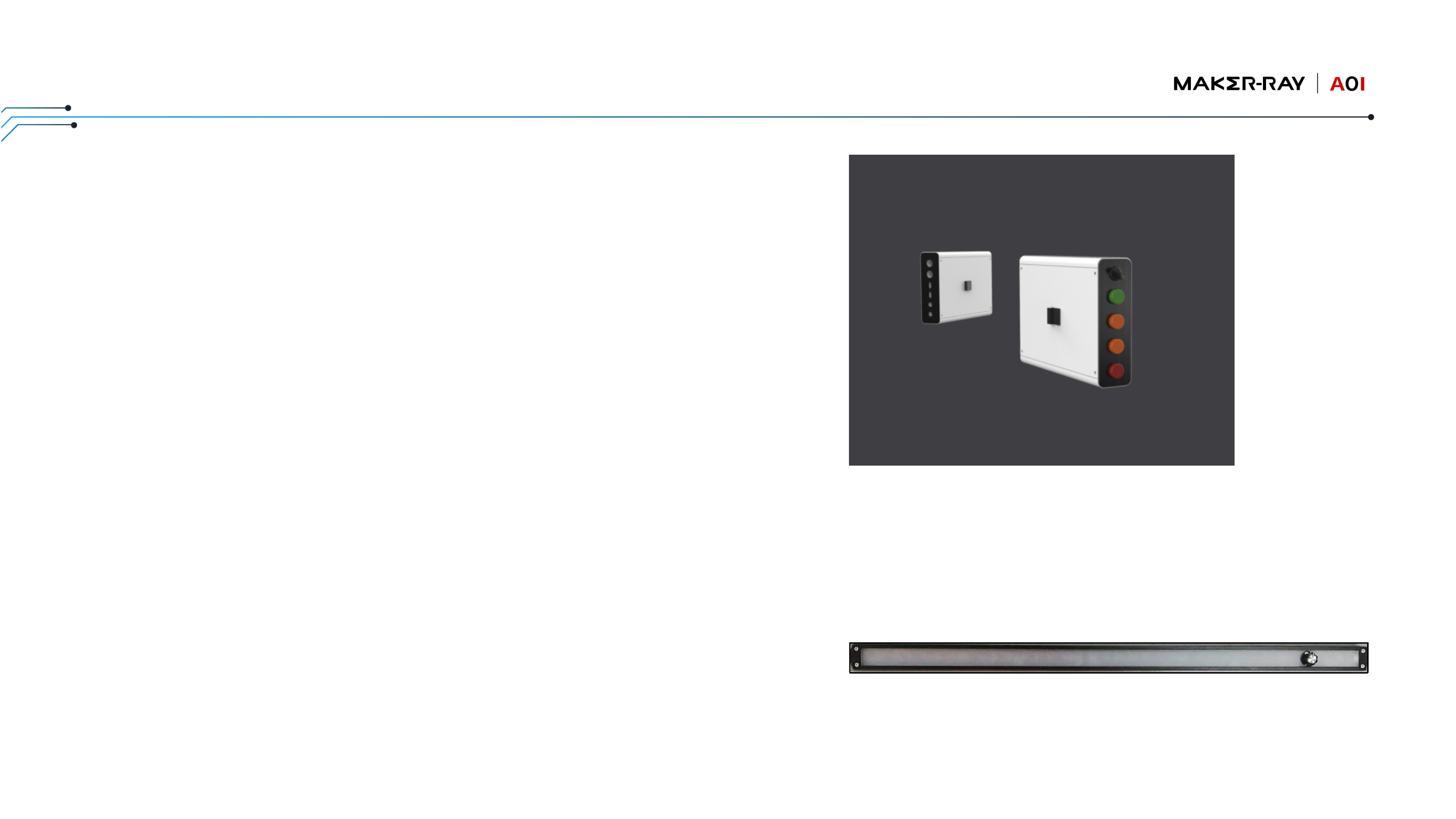 NG板卡跟踪器 • 当出现NG板卡的时候,可以通过LED灯判断NG板卡位置 • 设备报警后对不良板进⾏位置追踪,引导员⼯快速定位维修 • 提⾼维修效率,避免板卡紧挨时漏修或修错 • 设置简单,可直接放置在产线上,可随时移动 产线控制盒 • ⾃动/⼿动控制接驳台⽪带线启停、正反转,确保 不良及时维修 • 板卡、检测等异常时输出报警,控制警⽰灯报警 • 预留⼀组交互接⼝,可根据现场需求进⾏设计 • 控制盒体积⼩…