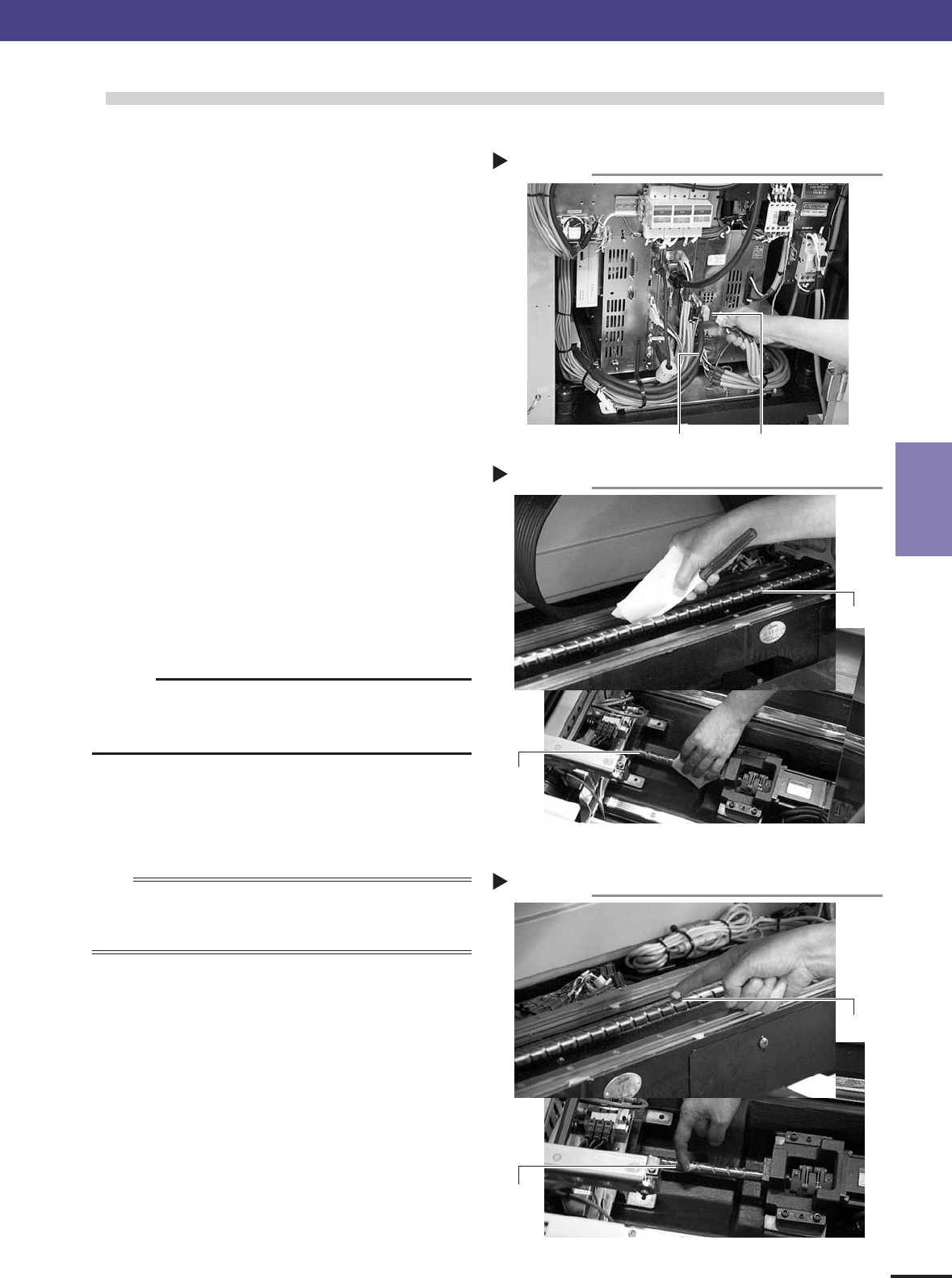 3- 6 3 Periodic maintenance items 2.3 Cleaning and greasing the X, Y and W-axis linear guide rails 1 Turn off the machine power switch. Quit the software operation and turn off the machine power. 2 Unplug the motor power…