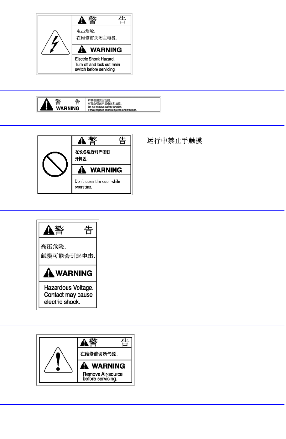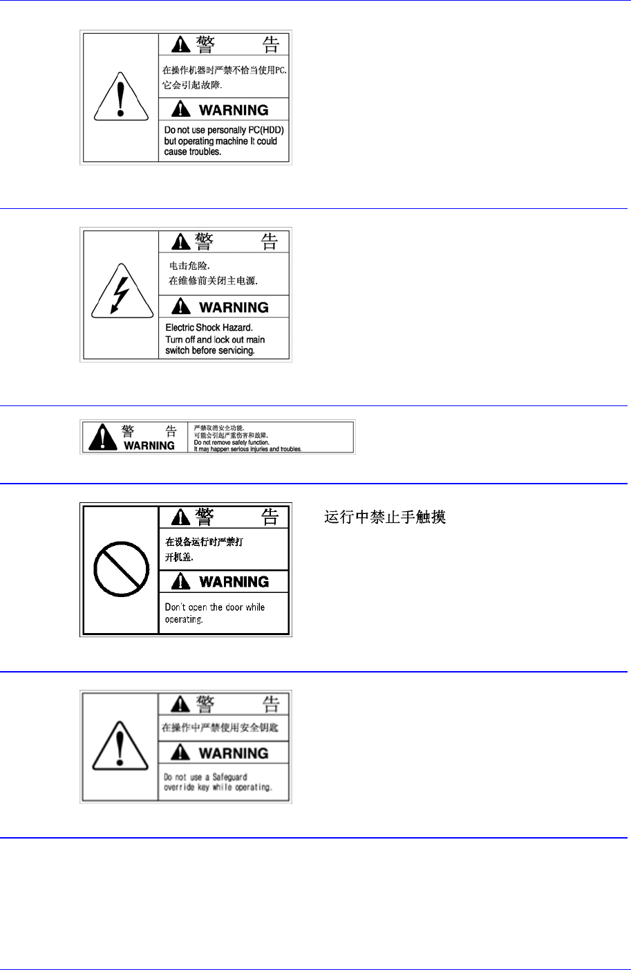 v 设备后面 设备后面贴有以下标签 . 0-2. 贴有此标签的位置设置有移动部 件,在运行 时如果分解移动部件或将盖子打 开使身体某 部分伸入到设备内部是非常危险 的。 在维护和修理设备或在纠正出错 操作前要先 中止设备运行。 除了 用 在设 备运 转 以外 , 禁 止 电脑 或硬 盘用 于其 它 用途 。否 则 ,可 能 导 致 设备 运转 上的 严重后果。